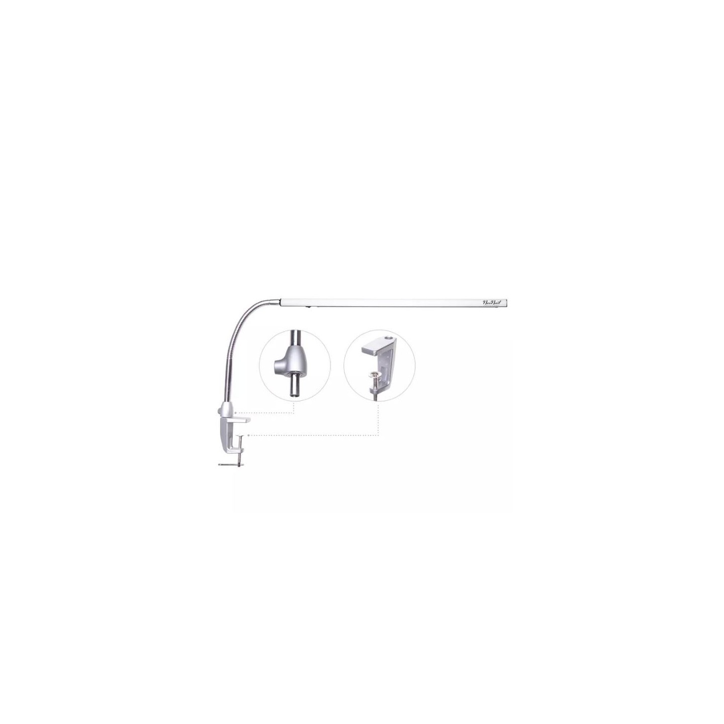 Bezcieniowa lampa nablatowa wykorzystywana do wykonywania profesjonalnych zabiegów manicure. Urządzenie przeznaczone jest do bezpośredniego mocowania do blatu, co zmniejsza zajmowaną przestrzeń. Dzięki zastosowaniu elastycznego ramienia, zapewniającego swobodne ruchy we wszystkich płaszczyznach, można precyzyjnie oświetlić pole robocze. Świetlówka zapewnia jasne, białe światło, które znacznie usprawnia wykonywane czynności. Lampa posiada też nowoczesny design, może więc stanowić element aranżacyjny wnętrza. Wykonana z aluminium oraz poliwęglanu daje trwałość oraz długą żywotność.