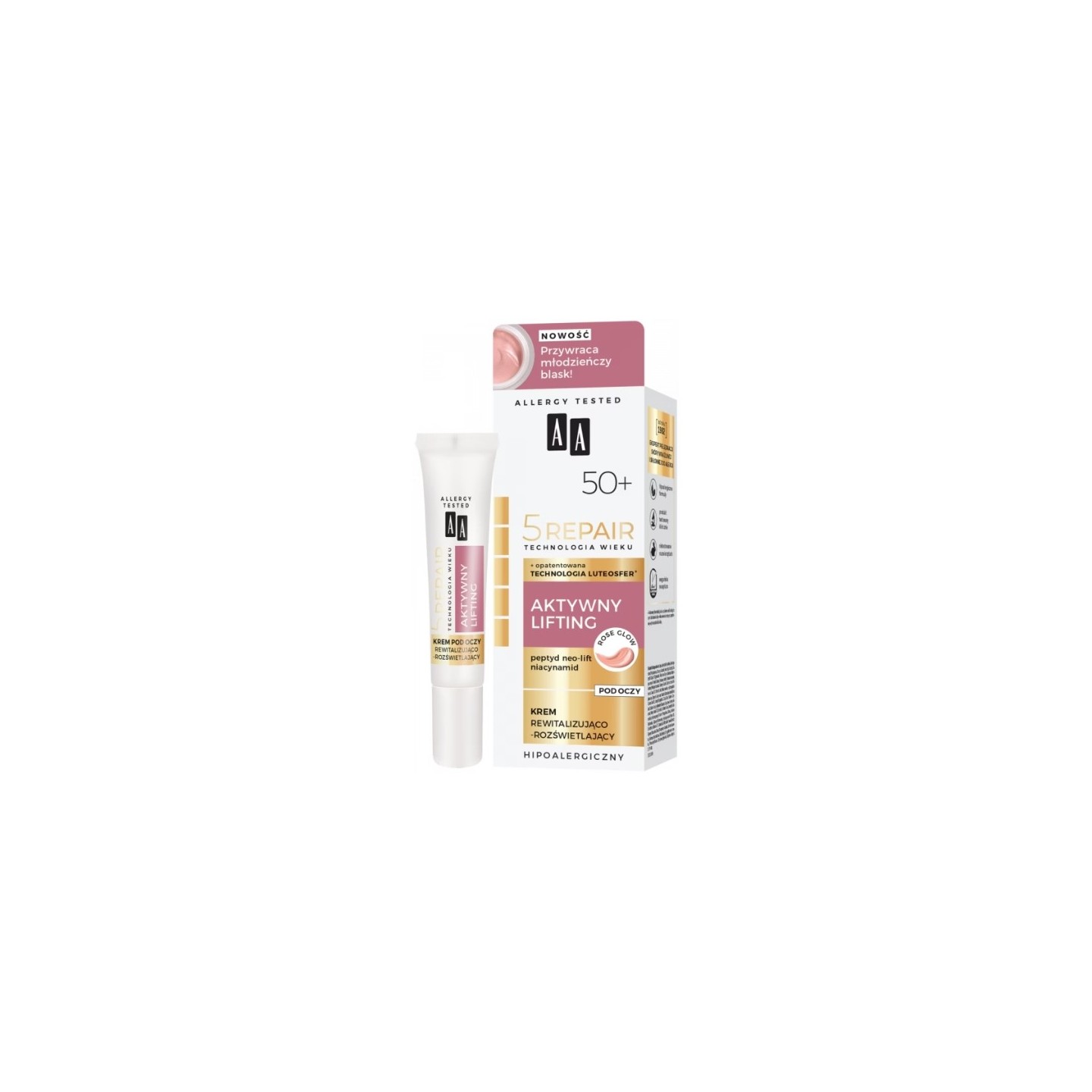 ВІТАЛІЗУЮЧИЙ ТА ОСВІТЛЮЮЧИЙ крем для повік забезпечує вражаючий омолоджуючий ефект, забезпечуючи підтяжку та зменшення зморшок, видиме зміцнення, а також насичене живлення та інтенсивне зволоження. Завдяки комплексу ROSE GLOW на основі трояндової олії та освітлюючих пігментів шкіра повертає сяюче, молоде сяйво. Гіпоалергенна формула, клінічно протестована на людях з шкірними алергіями, забезпечує найвищий рівень безпеки та ефективності навіть для найчутливішої шкіри.