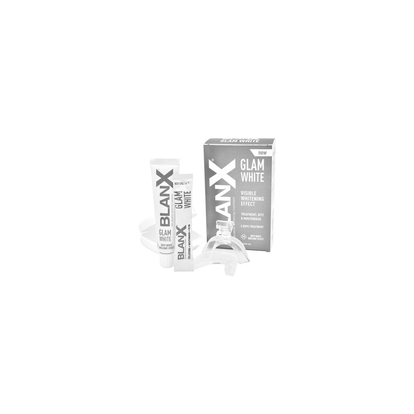 6-денна експрес-відбілююча процедура для природно ego посмішки. Інноваційна система відбілювання, яка дозволить відновити природну білизну зубів всього за 6 днів. Ця безпечна та неабразивна процедура була створена спеціально для тих, хто хоче швидко отримати сліпучу посмішку. У набір BlanX Glam White входить відбілююча serum , пакетики для полоскання ротової порожнини та термоформуючі накладки для верхніх і нижніх зубних дуг. Це комплексне рішення, яке забезпечує ефективне та зручне застосування. Унікальною особливістю процедури відбілювання є активні частинки PAP, які були спеціально розроблені для швидкого та видимого ефекту відбілювання. Молекули PAP ефективно зменшують знебарвлення і водночас мають тривалі антибактеріальні властивості, підтримуючи здоров’я порожнини рота. Важливо, що формула не містить перекису водню та інших небезпечних хімічних сполук, що робить її абсолютно безпечною для ваших слизових оболонок. Також не вимагає використання тепла або ультрафіолетових ламп.