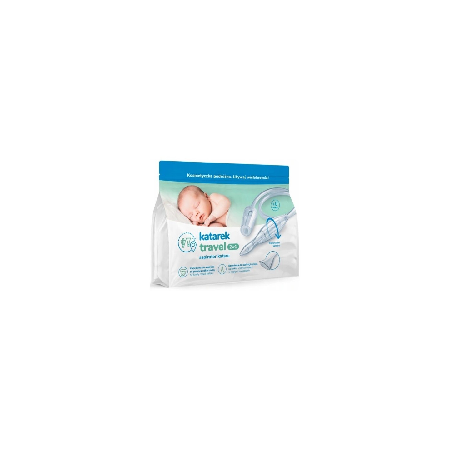 Katarek Travel - це практичне рішення 2-в-1 для дітей від 1 дня для боротьби з нежиттю. Пристрій має спеціальний роз’єм, який дозволяє вибрати спосіб аспірації. Версія, призначена для пилососа, ефективно справляється навіть з густим нежитем. Під час подорожей або прогулянок, коли немає доступу до пилососа, стане в нагоді оральна версія аспіратора, яка також ідеально підходить для щоденного догляду. У набір входять два носових наконечника, мундштук і щіточка для очищення камери і наконечників. Упаковка у вигляді косметички робить Katarek Travel практичним як для прогулянок, так і під час подорожей.