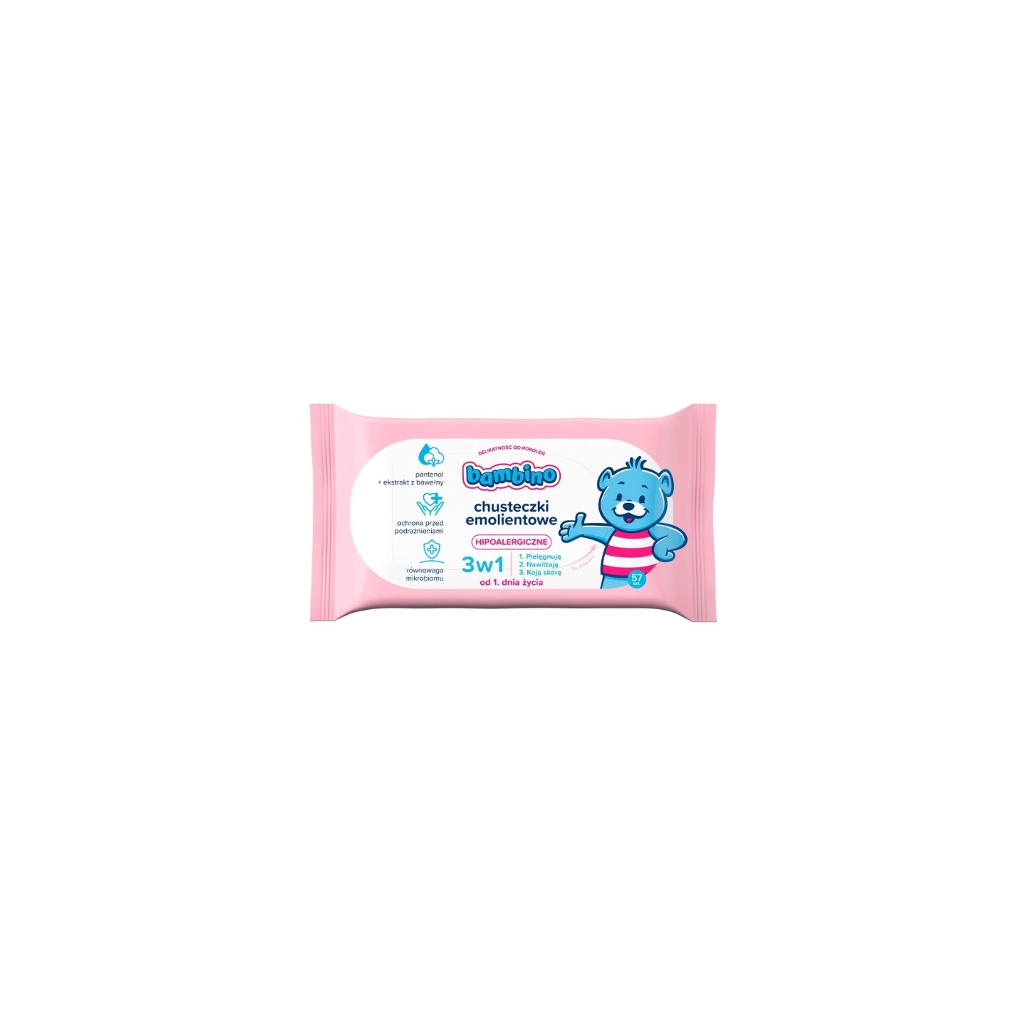 Серветки Bambino 3-in-1 Emollient Wipes – надзвичайно ніжні серветки для догляду, призначені для чутливої та сухої шкіри немовлят і дітей. Їх формула збагачена пом’якшувальними речовинами, які допомагають підтримувати належний рівень зволоженості, одночасно захищаючи гідроліпідний бар’єр шкіри. Серветки ніжно очищають, зволожують і доглядають за шкірою, не викликаючи роздратування. Вони безпечні з першого дня життя, а в їх складі немає спирту, парабенів і ароматизаторів. Вони ідеально si для зміни підгузників, ale також для щоденного миття рук і обличчя.