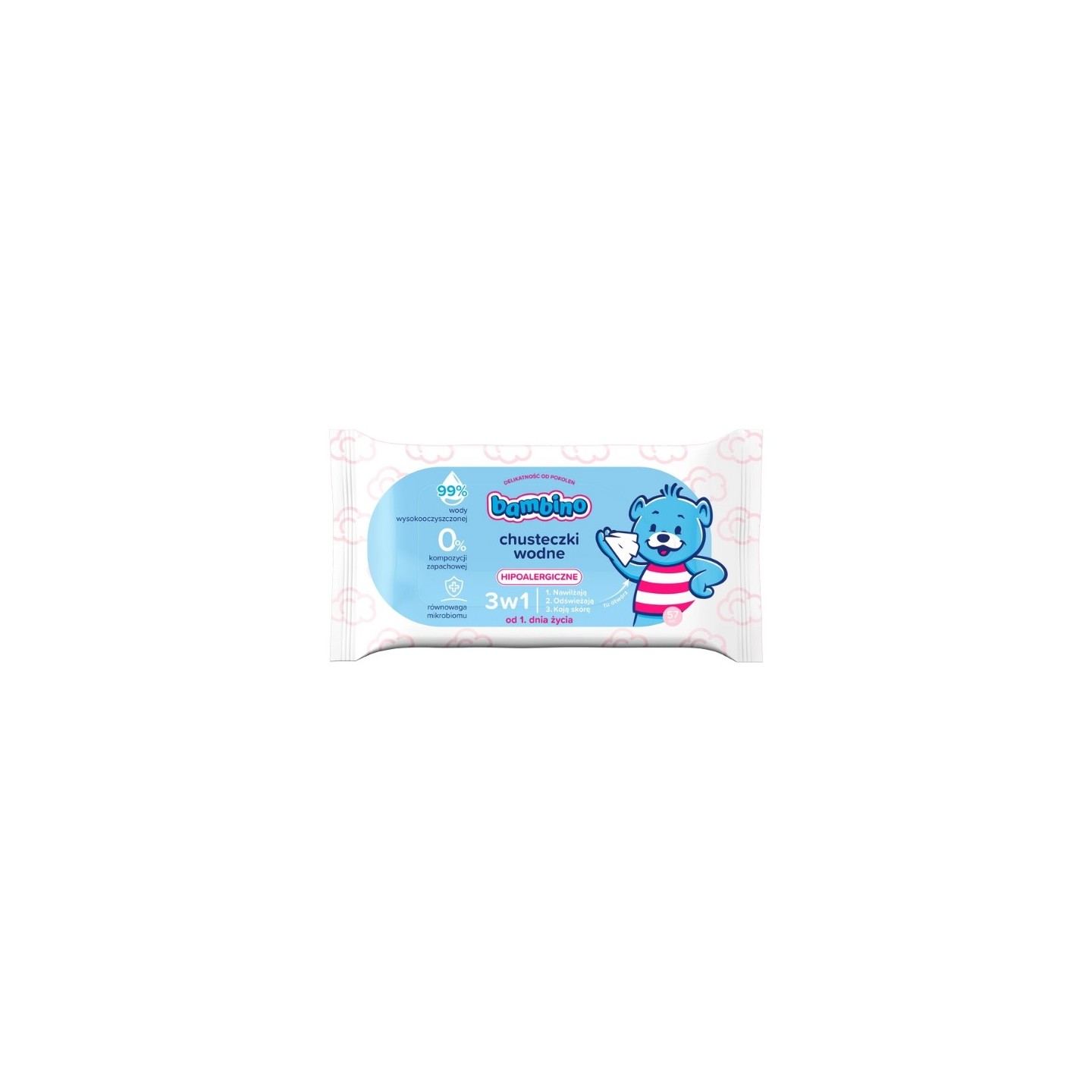 Bambino 3in1 Water Wipes - надзвичайно делікатні серветки, створені для щоденного догляду за чутливою шкірою немовлят і дітей. Вони містять до 99% води, що робить їх придатними для використання з перших днів життя. Вони ідеально si для зміни підгузників, миття рук і обличчя – без ризику подразнення. Формула серветок пройшла дерматологічне тестування і не містить спирту, парабенів і ароматизаторів. Ніжний матеріал м'який, міцний і безпечний для ніжної шкіри малюка.