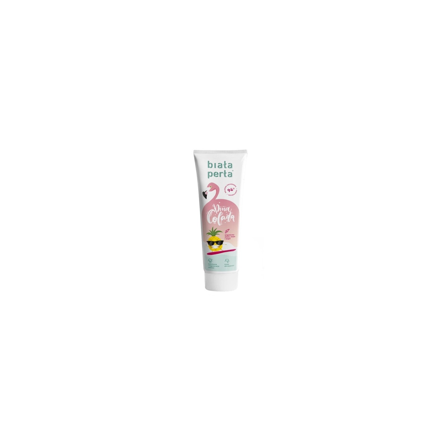 Зубна паста - ідеальний вибір для людей, які дбають про здорову та сяючу посмішку. Завдяки низькому коефіцієнту стирання, він дбайливо впливає на емаль і може використовуватися людьми з чутливими зубами. Паста допомагає видалити поверхневі зміни кольору, ремінералізує та зміцнює емаль, запобігає карієсу, регенерує та захищає ясна від запалення. Продукт ідеально підходить для щоденної гігієни порожнини рота і може використовуватися з звуковими зубними щітками. Паста має освіжаючий смак пінаколади і містить аж 94% інгредієнтів натурального походження. Паста містить такі активні інгредієнти, як нітрат калію, який знижує підвищену чутливість зубів, сік алое з протизапальними та заспокійливими властивостями для ясен, фтор (1300 ppm) та гліцерофосфат кальцію, які відповідають за ефективний захист від карієсу та ремінералізацію та зміцнення емалі. , а також фермент глюкозооксидаза, який бере участь у процесі відбілювання зубів і допомагає підтримувати баланс мікрофлори в ротовій порожнині.