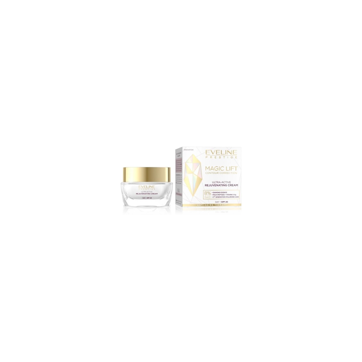 Виключно активна формула крему забезпечить видиме поліпшення стану шкіри. Розкішні активні інгредієнти допоможуть сформувати овал обличчя та ефективно розгладять і зміцнять колір обличчя. Діамантова есенція діє як еліксир молодості, відновлюючи структуру шкіри та забезпечуючи її життєву силу. Мультипептиди та сучасна форма гіалуронової кислоти стимулюють вироблення колагену та еластину, зменшать зморшки та забезпечать регенерацію. Вітамін C+Cg зменшить видимість плям, освітлить і живить колір обличчя. SPF 20 захистить шкіру від фотостаріння.