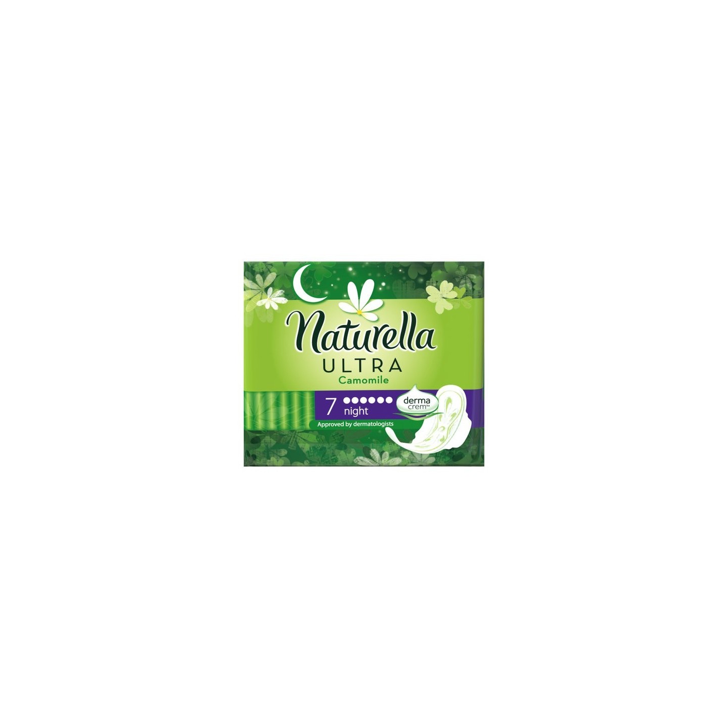 Гігієнічні прокладки Naturella Ultra Night Camomile мають крильця, які утримують прокладку на місці, захищають вашу ніжну шкіру та забезпечують захист вночі, у разі сильної кровотечі під час менструального циклу. Це єдині засоби жіночої гігієни, які містять Dermacrem™ - сухий лосьйон, який запобігає подразненню шкіри.