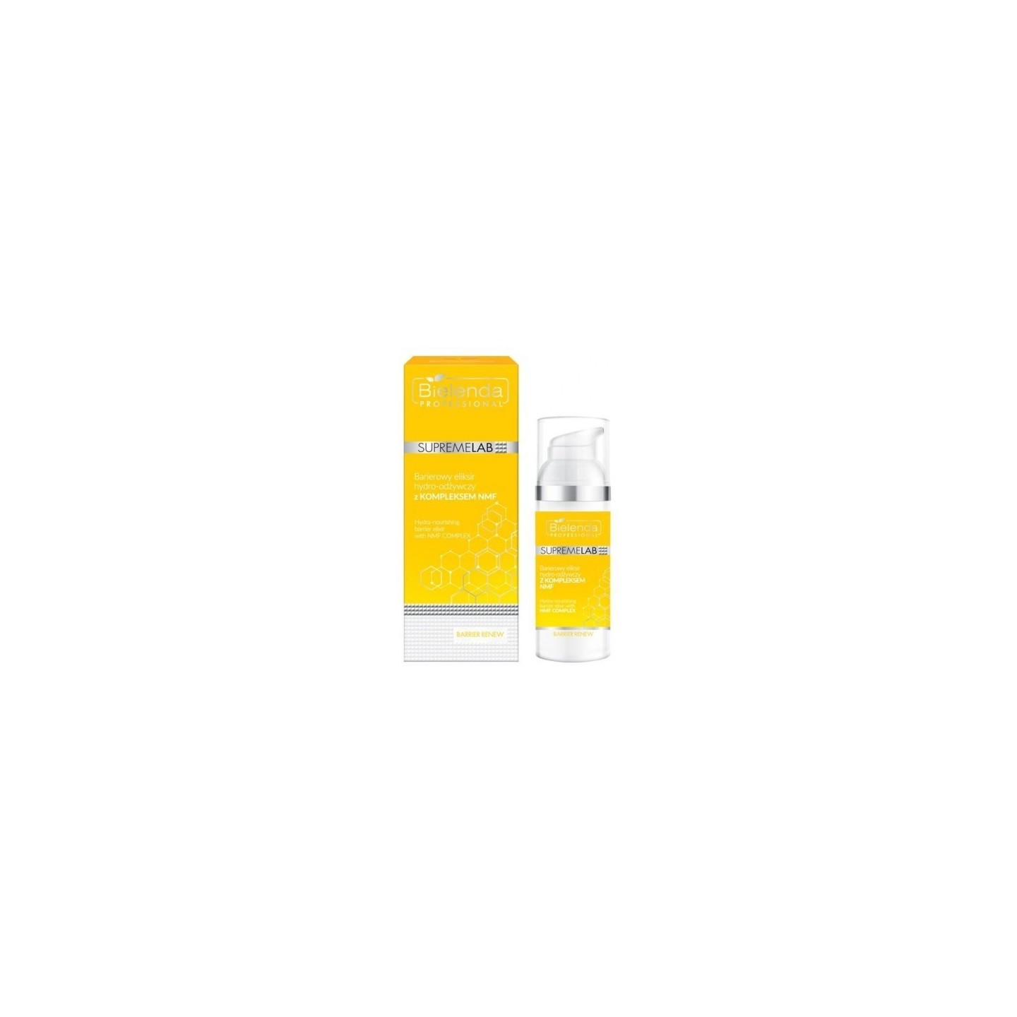 Bielenda Professional SupremeLAB Barrier Renew hydro -живильний бар'єрний еліксир для обличчя з комплексом NMF - це косметика з живильної, сильно відновлюючої та зволожуючої лінії, яка підтримує відновлення здорового бар'єру шкіри. Комплекс NMF має сильний зволожуючий і водоутримувальний ефект. Комплекс захищає від зневоднення і дозволяє підтримувати оптимальну гідратацію. Вітамін B3 нормалізує, зміцнює гідроліпідний бар'єр, заспокоює і знімає запалення. Кераміди, що містяться в еліксирі, зміцнюють шкірний бар'єр, підтримують зволоження та живлення. Вони підвищують пружність і еластичність.