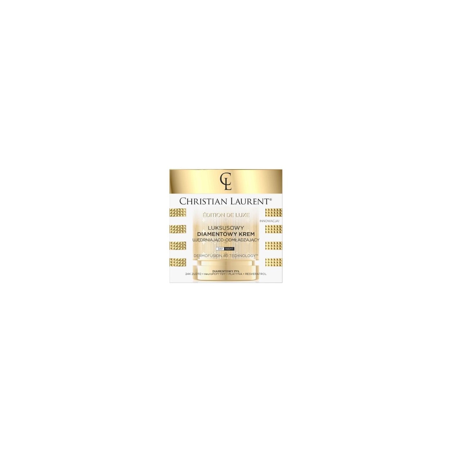 Концентрована формула крему, багата цінними інгредієнтами, створена для інтенсивного ексклюзивного омолоджуючого догляду за всіма типами шкіри. Оксамитова текстура чуттєво огортає шкіру, забезпечуючи миттєвий ефект глибокого живлення та розгладження. DIAMOND DUST чудово омолоджує зовнішній вигляд шкіри, сприяє регенерації та делікатно освітлює. 24K GOLD має зміцнюючий і глибоко зволожуючий ефект. НейроПЕПТИДИ останнього покоління мають сильний ефект проти зморшок і ліфтингу, вирівнюють тон шкіри, живлять і розгладжують. РЕСВЕРАТРОЛ є одним з найефективніших антиоксидантів. Нейтралізує вільні радикали, має регенеруючі та антивікові властивості. ТЕХНОЛОГІЯ 4D DERMOFUSION Революційна технологія використовує інфузійний механізм для транспортування активних інгредієнтів за допомогою мікротрансмітерів останнього покоління, які називаються стимуляторами клітинного переходу, які забезпечують точний перенос активних інгредієнтів у глибокі шари шкіри та їх послідовне, поступове вивільнення.