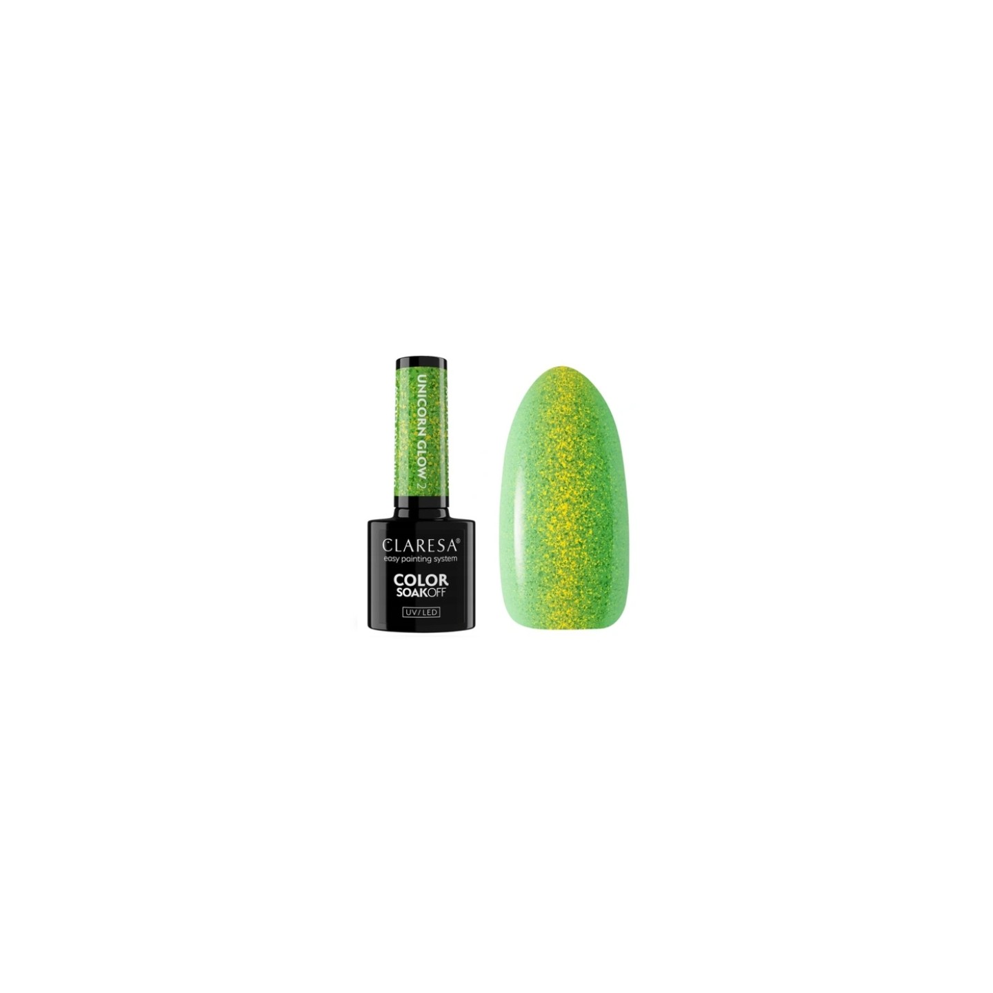 Claresa Unicorn Glow 2 – це напівпрозорий гібридний лак ефірного зеленого відтінку, збагачений блискучими золотими частинками, що створюють ефект «мокрого сяйва». Мінливість відблисків надає manicure казкового характеру – немов чарівний шар світла, що оживає з кожним рухом руки.
