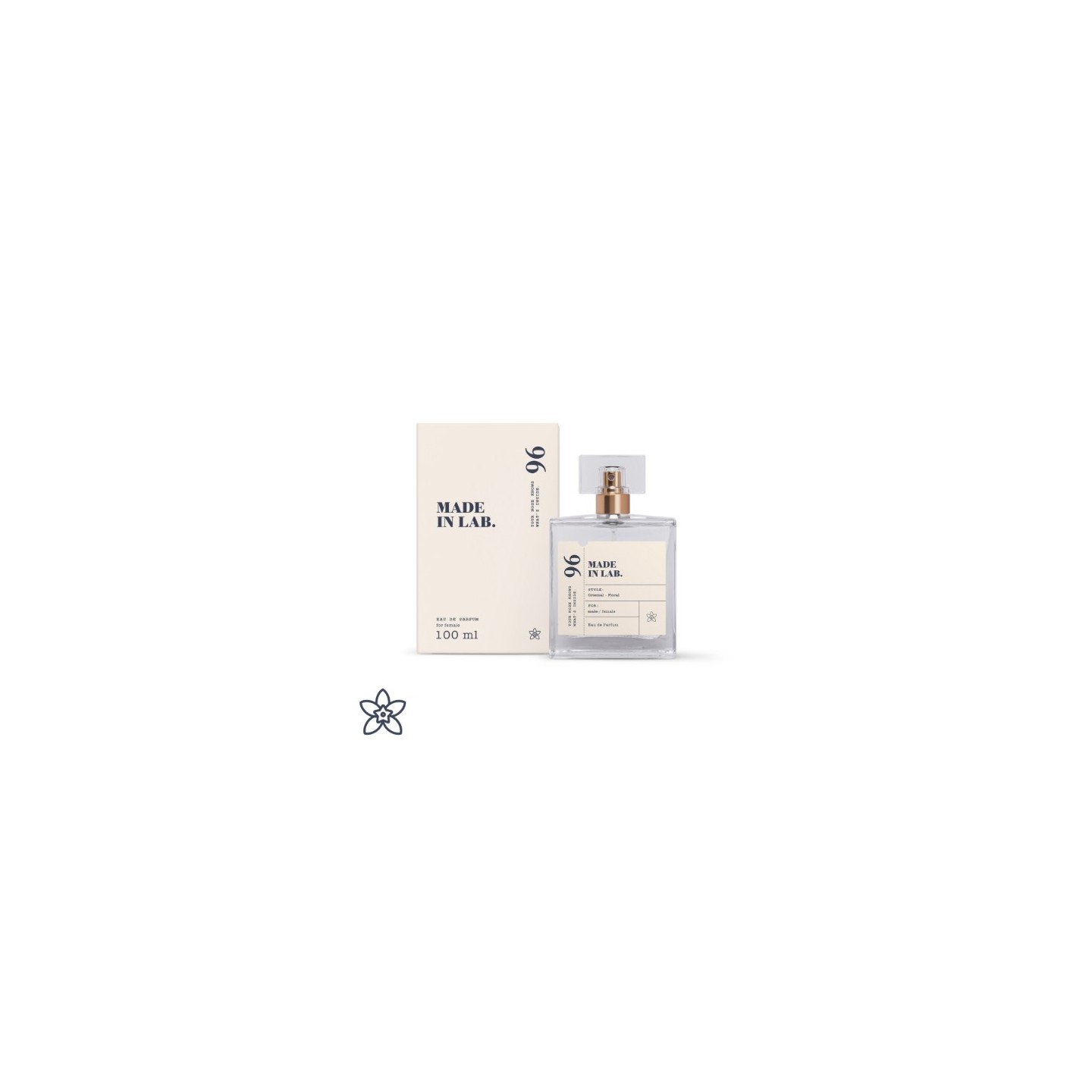 Made in Lab 96 — парфумована вода для жінок, яка є заміною аромату Viktor & Rolf Flowerbomb*. Ця композиція є справжнім сплеском солодких та іскристих нот, починаючи з бергамоту та чаю, які збережуть вас освіжаючими. У серці квітковий букет створює пишну жіночу ауру. Базові ноти містять теплі та чуттєві елементи, такі як пачулі, ваніль і мускус, додаючи глибини, насиченості та ніжної солодкості, створюючи стійкий спокусливий шлейф. Це сильний, романтичний і захоплюючий аромат, який поєднує в собі свіжість цитрусових, чарівність квіткових акордів і тепло східних нот, створюючи багатошарову ароматну композицію. Це аромат, який залишає незабутнє враження.