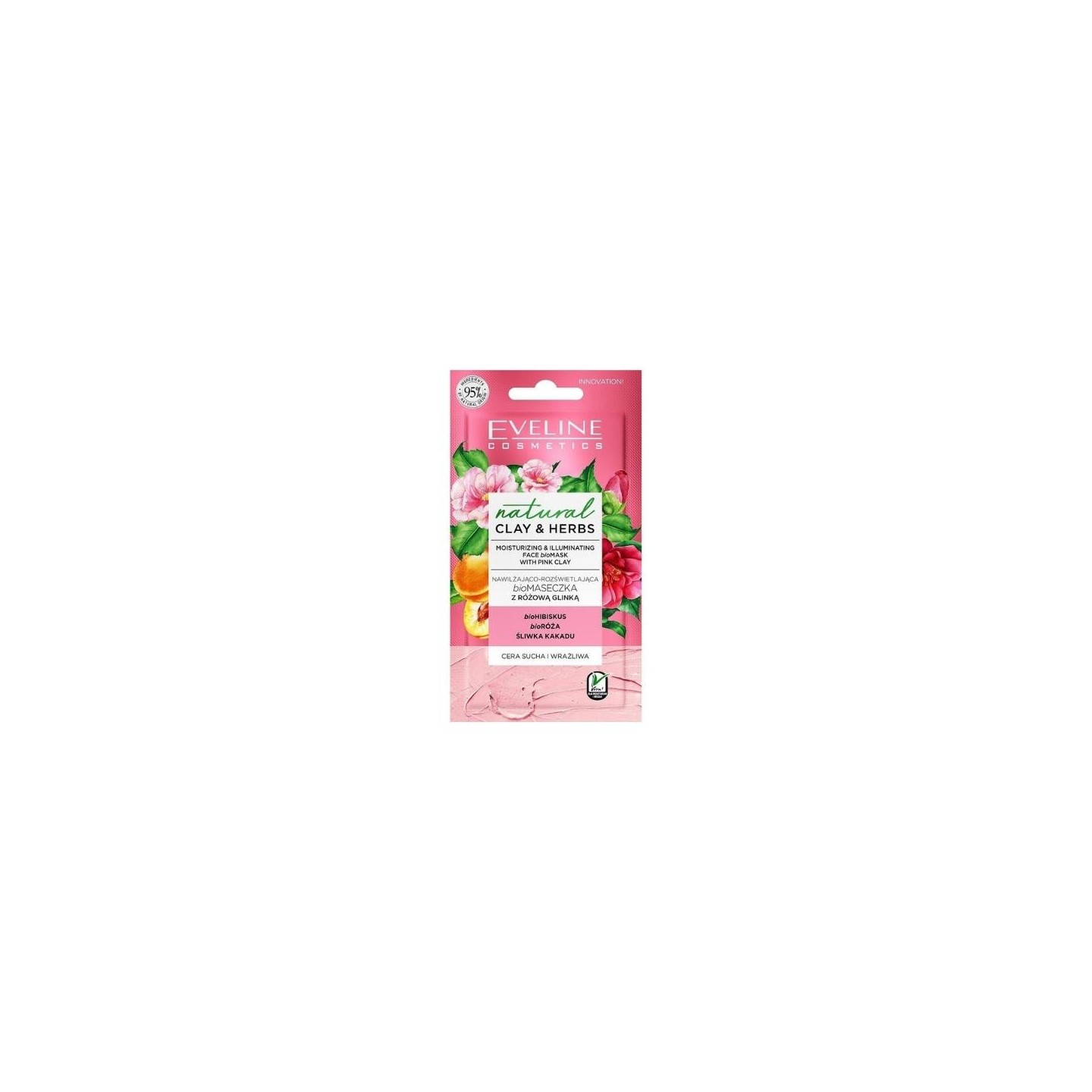 • Eveline Natural Clay & Herbs зволожуюча та освітлююча біомаска з рожевою глиною 8 мл