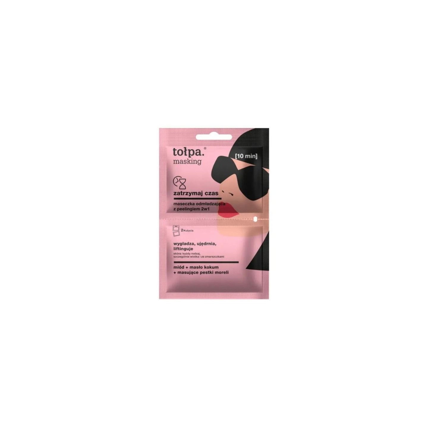 Tołpa Masking Rejuvenating Mask with Peeling 2in1 — це маска, призначена для догляду за всіма типами шкіри, особливо в’ялою. До її складу входять мед і масло кокума, які розгладжують, зміцнюють і живлять шкіру. Маска також забезпечує чудовий ліфтинг-ефект і освіжає епідерміс. Формула маски також збагачена кісточками абрикоса, які очищають шкіру від забруднень і покращують її зовнішній вигляд і еластичність.