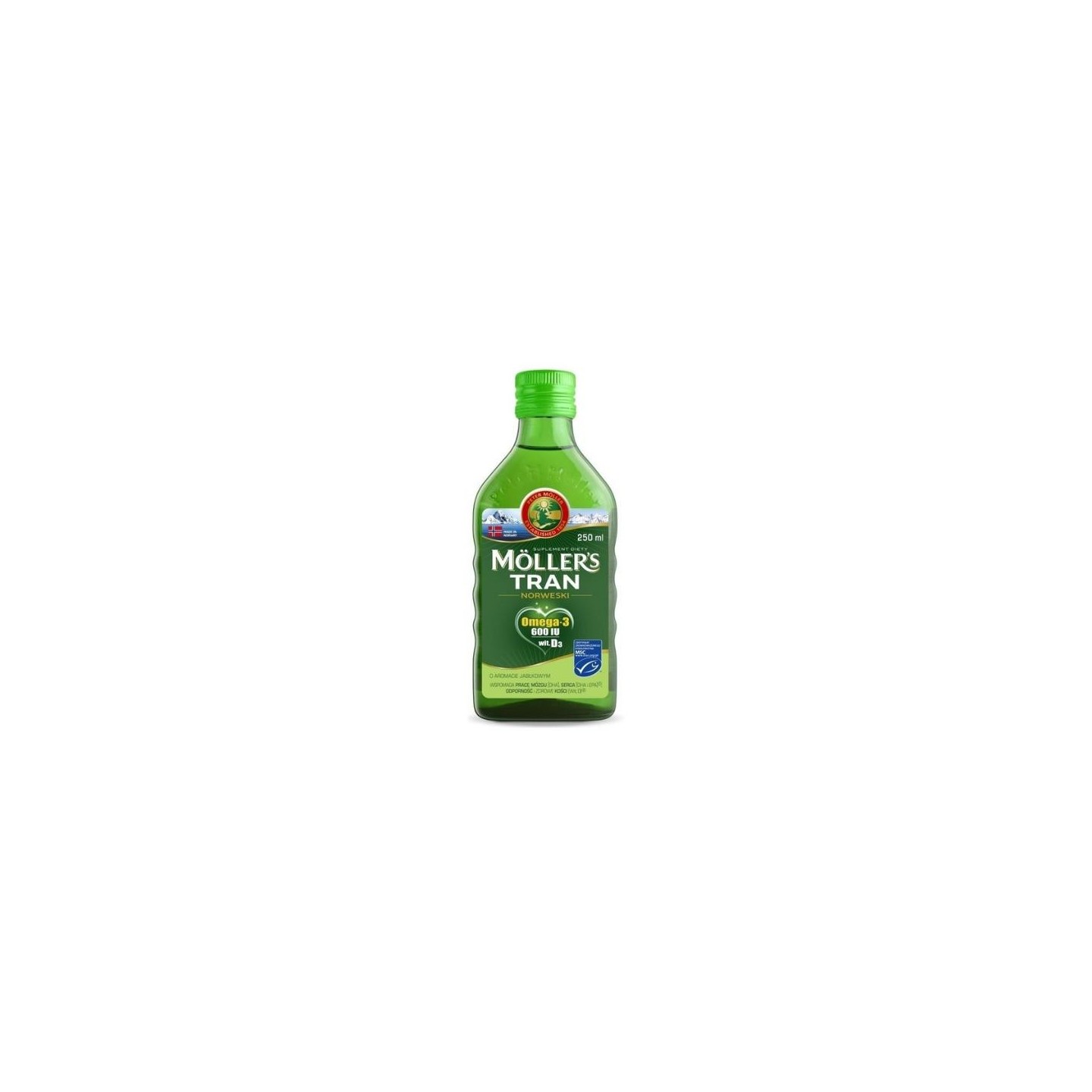 Норвезька риб'яча олія зі смаком яблука - дієтична добавка в рідкій формі. Продукт містить високоякісний і чистий жир печінки тріски. Як і інші види риб’ячого жиру, яблучний варіант підходить як для дітей старше 3 років, так і для дорослих. Риб'ячий жир від Möller's - це дієтична добавка, що містить Омега-3 жирні кислоти та вітаміни А і Е.