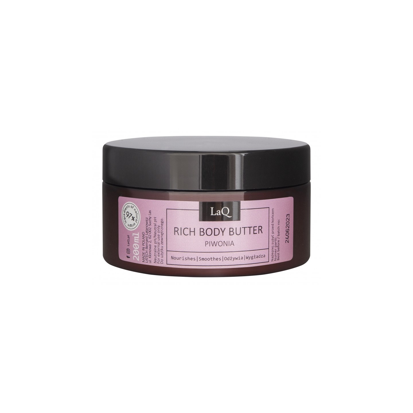 СКЛАД: Aqua , масло Butyrospermum Parkii, гліцерин, олія Prunus Amygdalus Dulcis, цетеариловий спирт, полігліцерил-3 метилглюкози дистеарат, гліцерилстеарат, ізоаміллаурат, Panthenol , олія насіння Citrullus Vulgaris, олія насіння Rubus Idaeus, Cannabis Sativa Олія насіння, смола Copaifera Officinalis , гліцерил ізостеарат, пальмітоіл гідролізований пшеничний протеїн, калієвий кокоїл гідролізований пшеничний протеїн, гліциретинова кислота, алантоїн, лецитин, олія європейського плоду, екстракт квітів півонії лікарської, лактобактерії, альфа-глюкан олігосахарид, полімнія сонхіфолія Сік Juice , лактат натрію, PCA натрію, Гліцин, фруктоза, сечовина, ніацинамід, інозит, молочна кислота, мальтодекстрин, глюконат натрію, ксантанова камедь, лимонна кислота, бензиловий спирт, бензойна кислота, дегідрооцтова кислота, токоферол, бензоат натрію, сорбат калію, парфуми, альфа-ізометиліонон, бензилсаліцилат , цитронелол, гексил циннамаль, гідроксицитронелаль, лімонен, ліналоол.