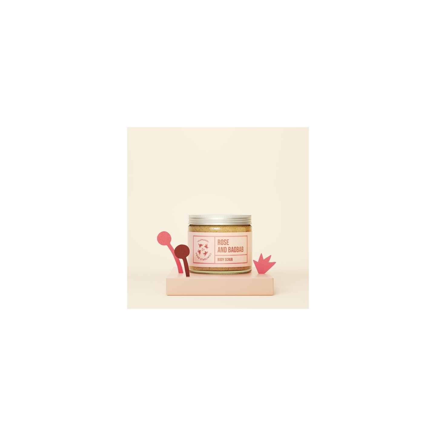 Натуральний цукровий скраб для тіла з троянди та баобаба — це гармонійне поєднання ефективного відлущування, інтенсивного живлення та чуттєвого аромату. Завдяки кристалам тростинного цукру та частинкам насіння дикої троянди пілінг м’яко ale ефективно видаляє мертву шкіру, роблячи шкіру шовковистою гладкою та сяючою. Регулярне використання, особливо в поєднанні з масажем, стимулює кровообіг, сприяє боротьбі з целюлітом і робить шкіру більш підтягнутою та пружною. Формула пілінгу заснована на ретельно відібраних поживних речовинах. Масло баобаба, багате на вітаміни A, E, D і F, сприяє регенерації шкіри, має підтягуючий ефект і допомагає зменшити ознаки старіння. Лляна олія запобігає втраті води, зволожує та зміцнює захисний бар'єр шкіри. Масло ши створює ніжну захисну плівку, яка захищає від шкідливих зовнішніх факторів, а масло жожоба пом'якшує і має антиоксидантні властивості. Ароматний аромат скрабу - це тонке поєднання солодкості та свіжості. Ефірні олії рожевого дерева і грейпфрута надають йому унікальний, злегка фруктовий і трав'яний характер. Він нагадує аромат пампушки з трояндовою начинкою або ароматного чаю, але з ніжною ноткою цитрусового освіжання, яке стимулює почуття та викликає стан релаксації.