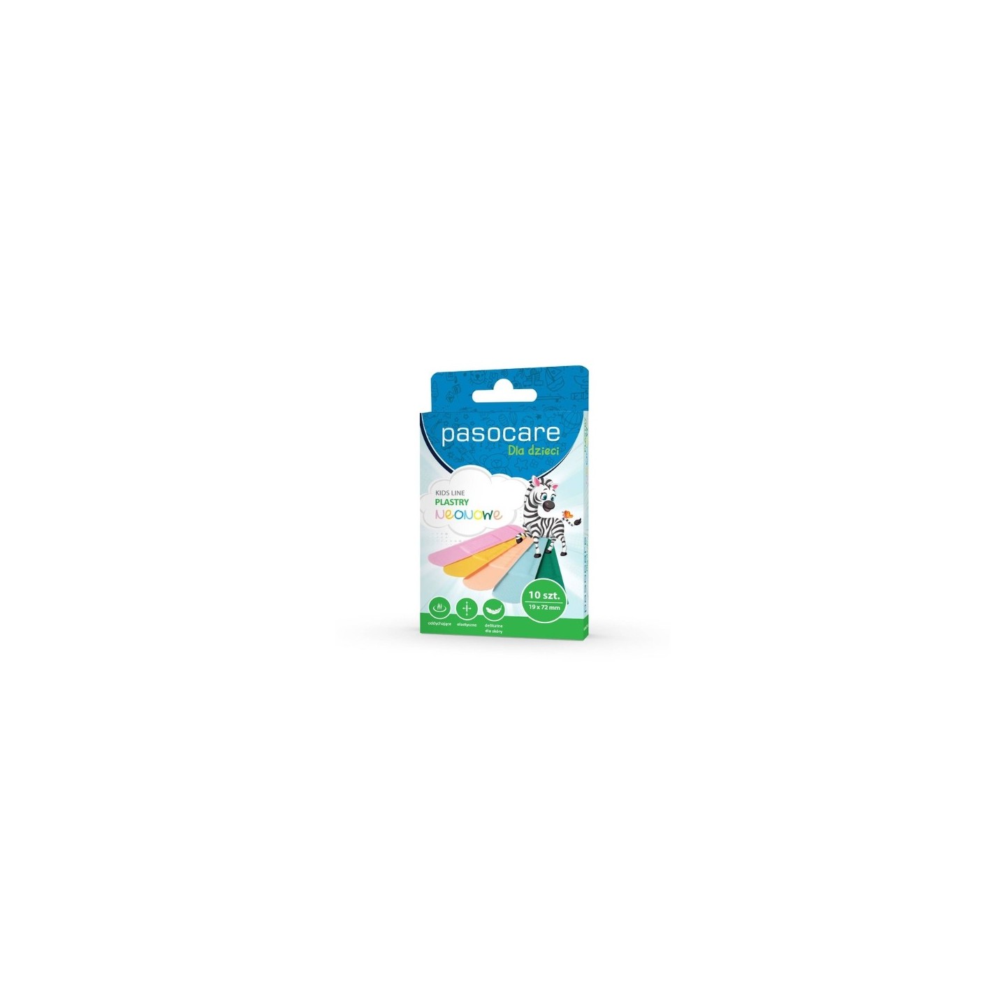 Pasocare Kids — це набір із 10 пластирів, призначених для захисту невеликих порізів і садна у дітей. Патчі доступні в інтенсивних неонових кольорах, що робить їх візуально привабливими для наймолодших користувачів.