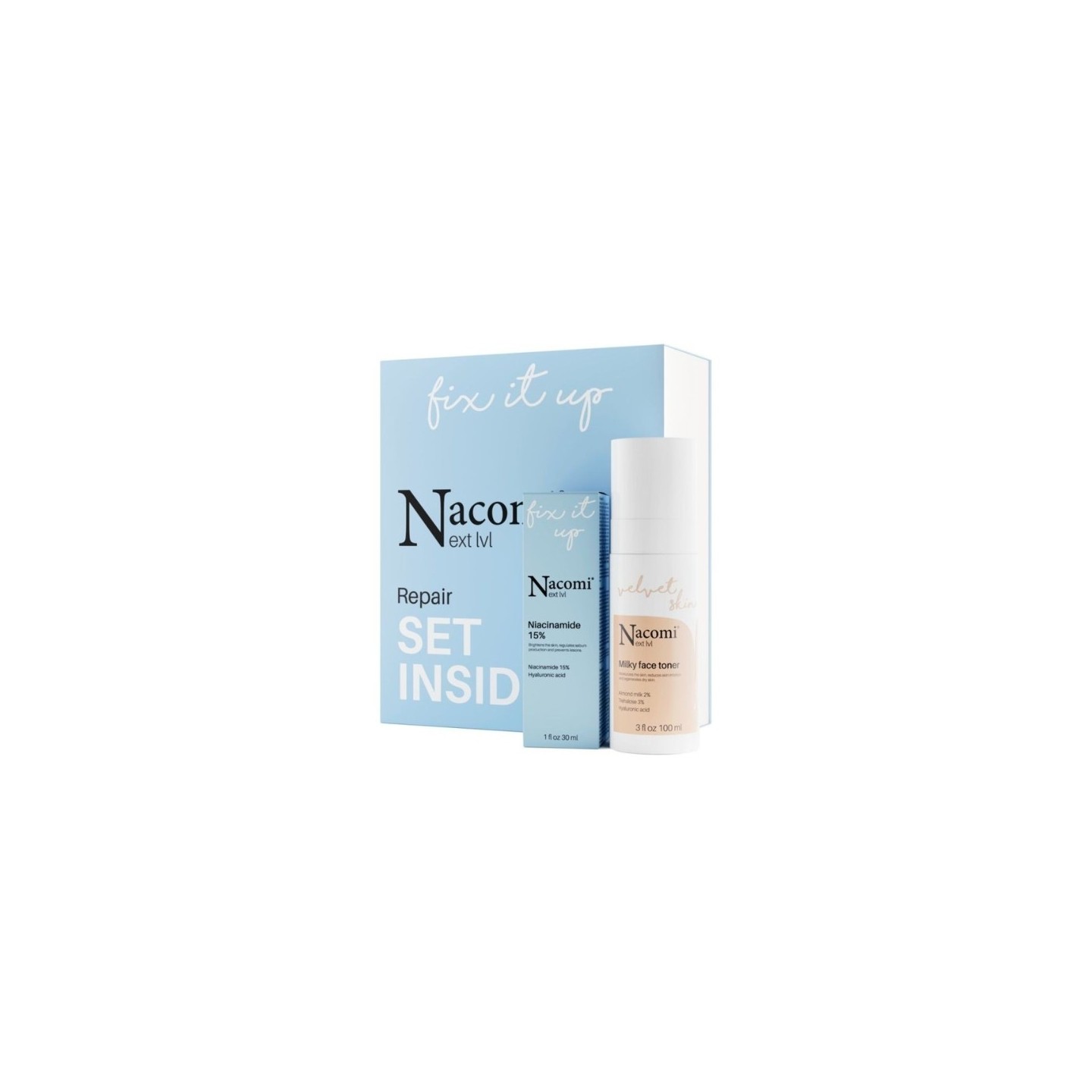 Подарунковий набір Nacomi Next Level Repair Зволожуючий молочний тонік 100 мл + ніацинамінова Serum 15% 30 мл